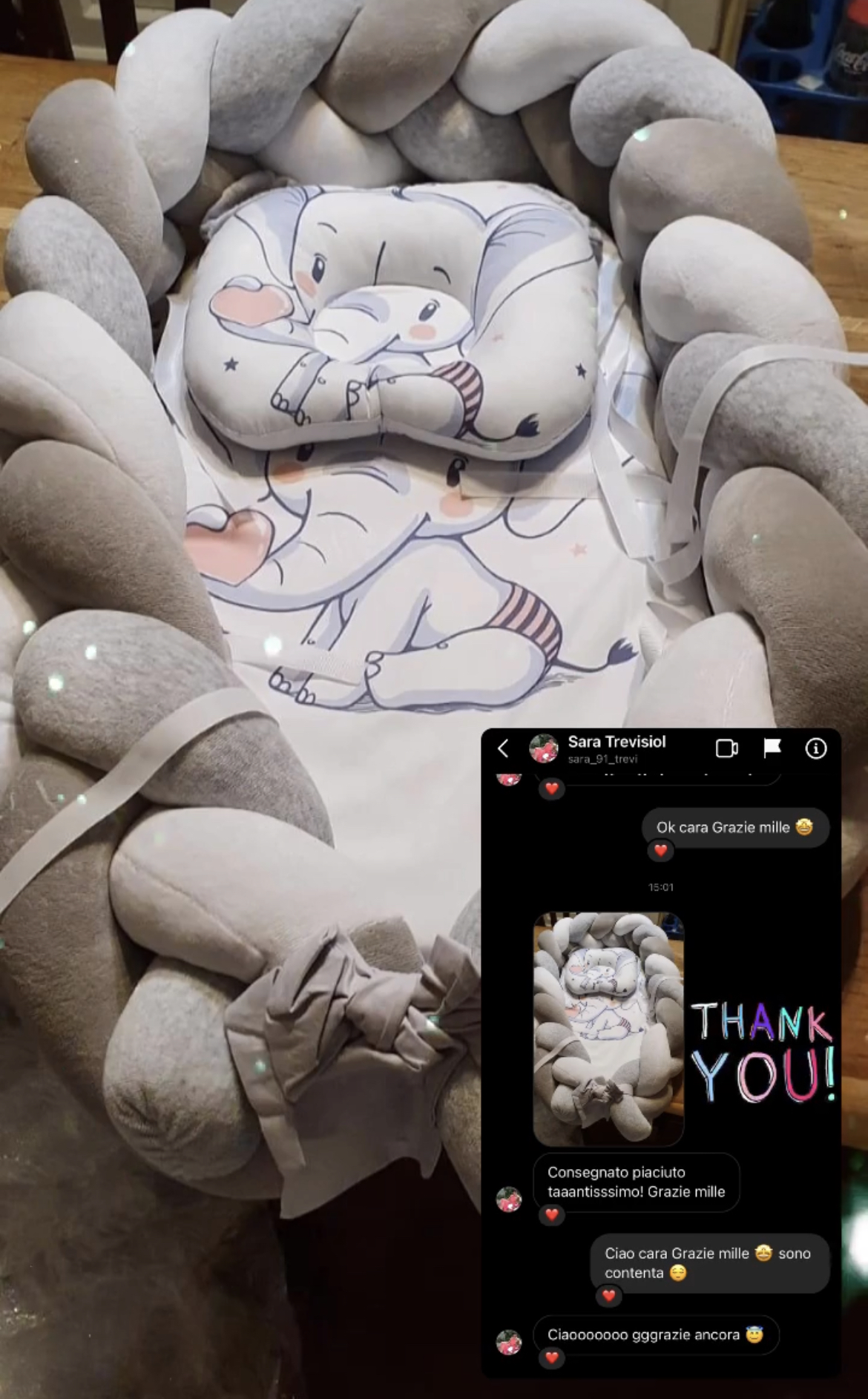Prodotto bello è anche molto utile soprattutto perché ogni parte la si può usare singolarmente. Il cuscinetto diciamo che personalmente non l'ho utilizzato ma la treccia messa nel lettino è comoda in quanto più bassa rispetto ai soliti "paracolpi" quindi permette di vedere il neonato anche senza sollevarsi e il materassino lo si può utilizzare in qualsia posto si voglia coricare il piccolo.. Inoltre è tutto lavabile con estrema facilità. Ringrazio davvero queste ragazze per la creazione bella ma utilissima!