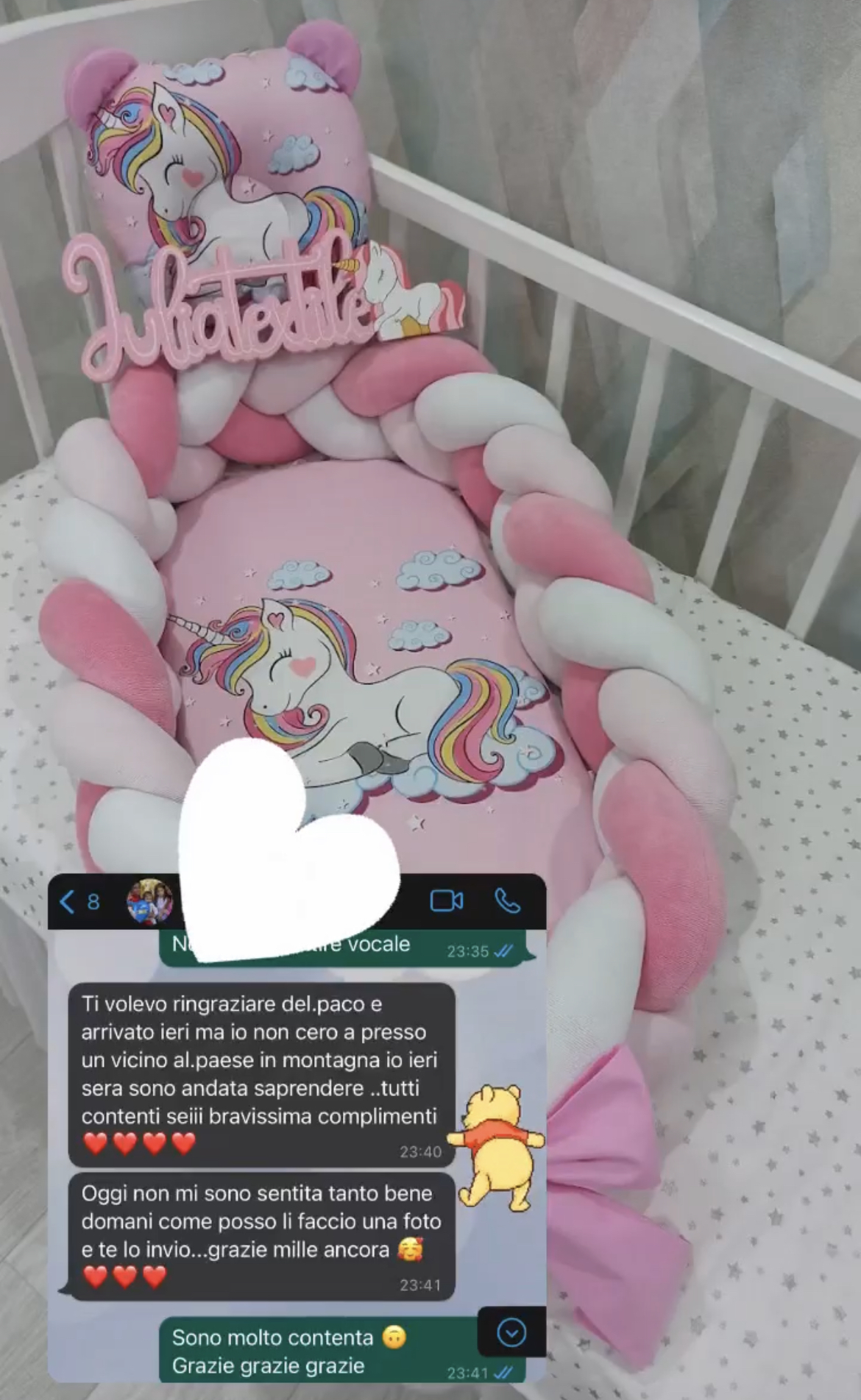 Ho acquistato il riduttore, paracolpi, giostrina e catenella porta ciuccio…tutto meraviglioso e curato nei minimi particolari!! Julia è disponibile e bravissima…super consigliato