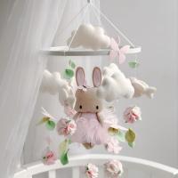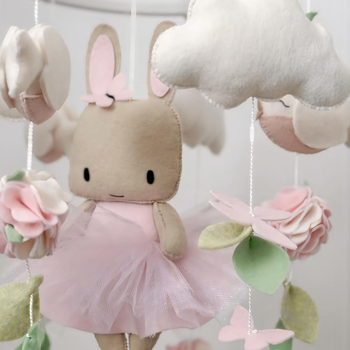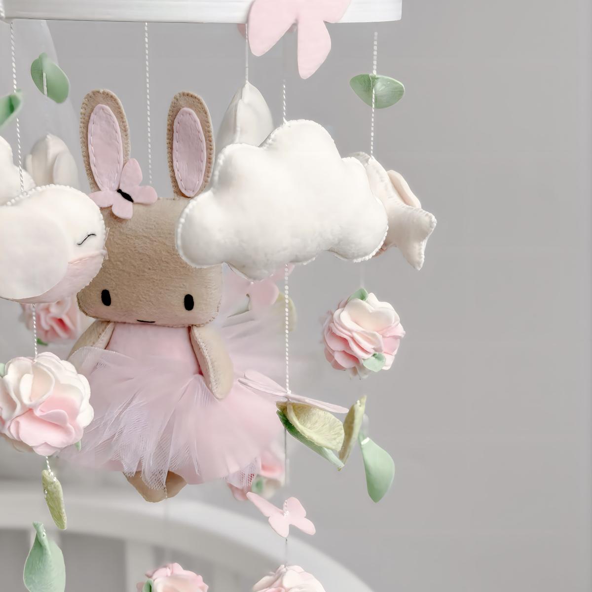 Giostrina musicale artigianale nei delicati toni rosa con coniglietta, nuvole soffici e fiori decorativi.