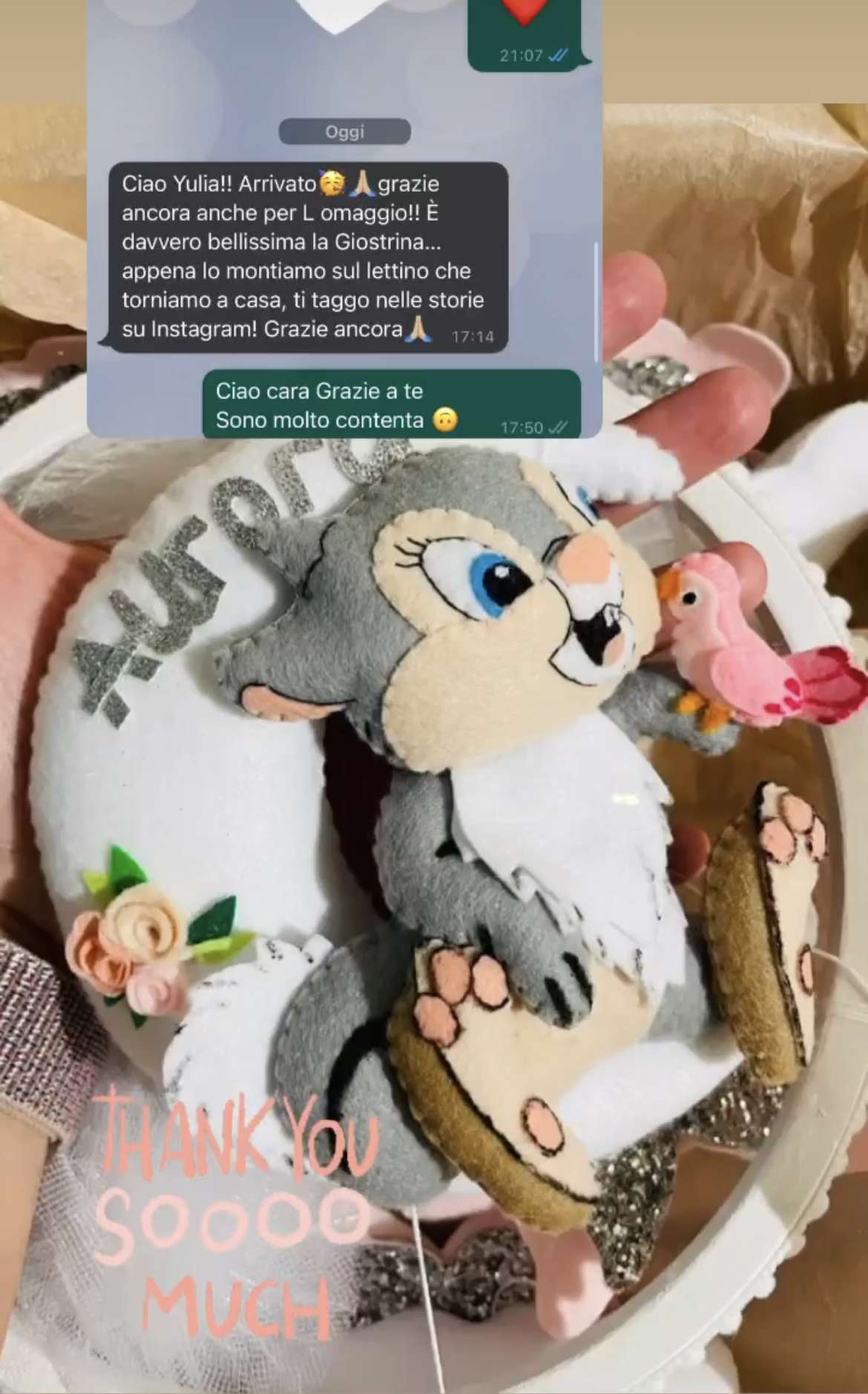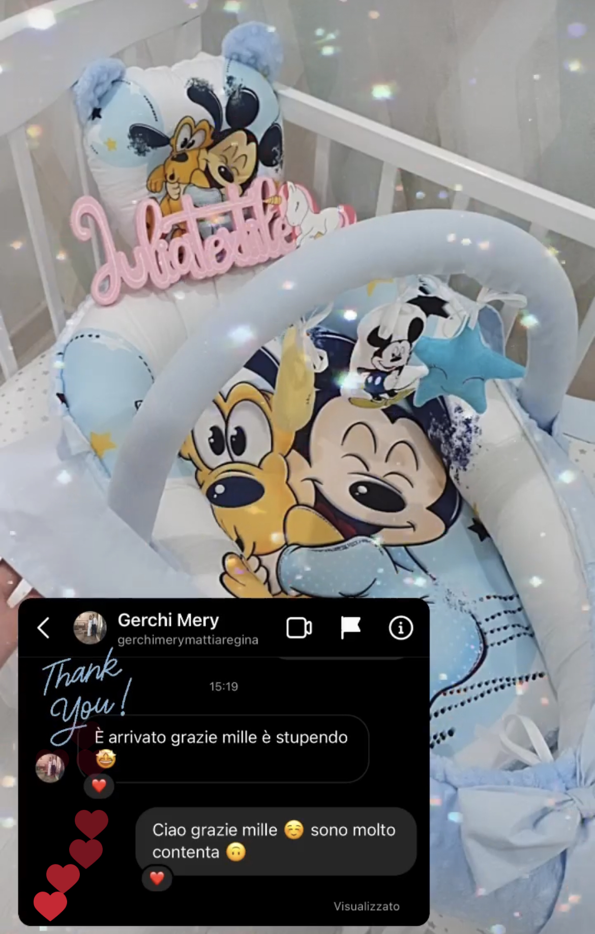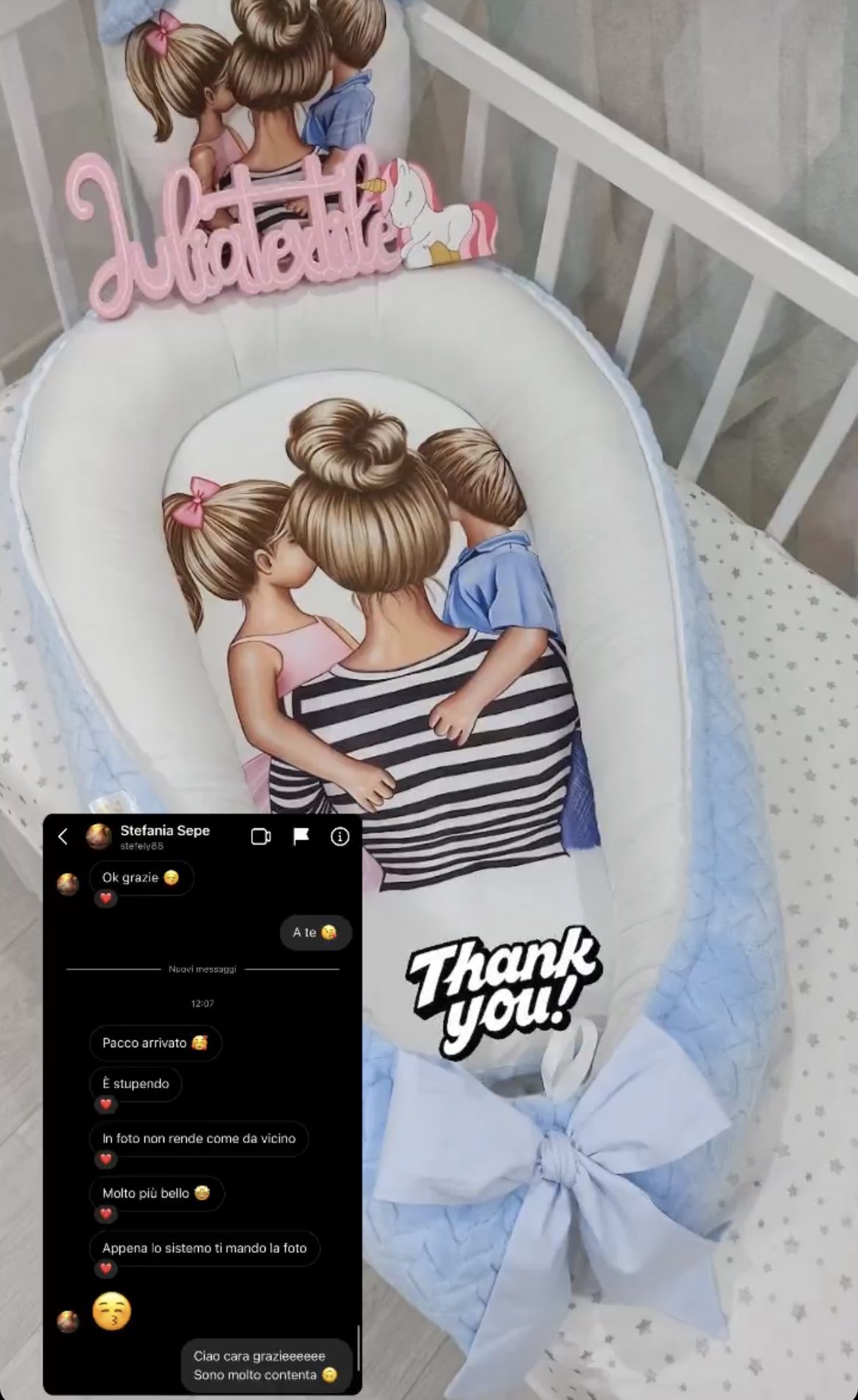 Ho acquistato il riduttore, paracolpi, giostrina e catenella porta ciuccio…tutto meraviglioso e curato nei minimi particolari!! Julia è disponibile e bravissima…super consigliato