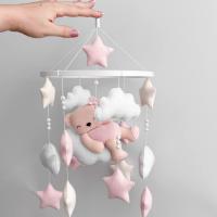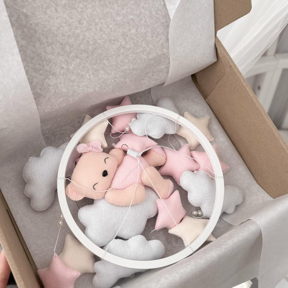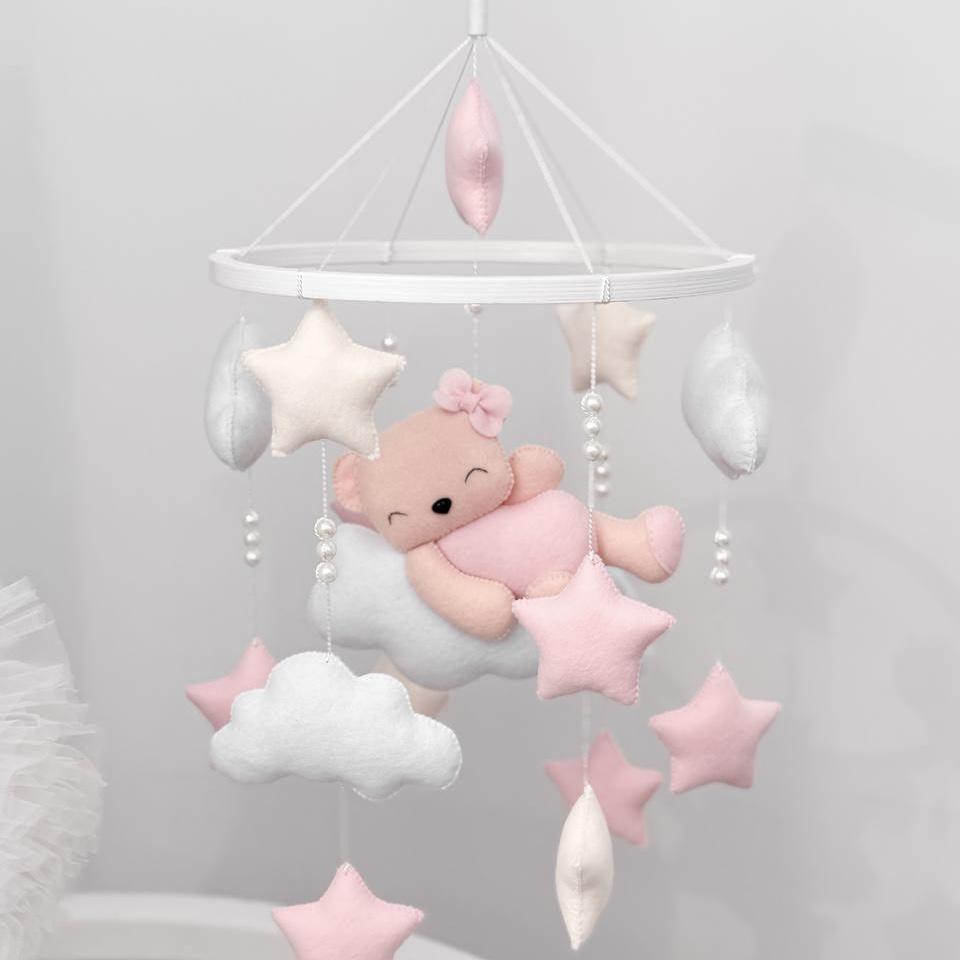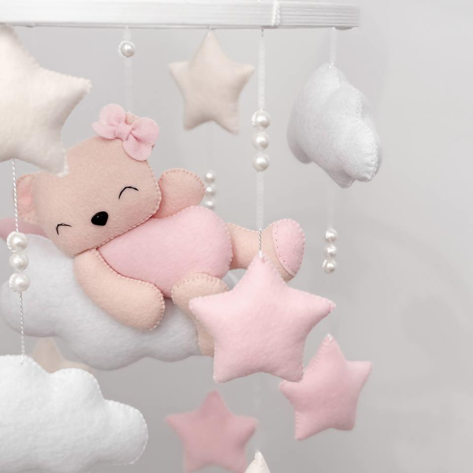 Giostrina musicale fatta a mano con dolce orsetto rosa che dorme su una nuvola, stelle e perline decorative. Realizzata con materiali sicuri e ipoallergenici, porta magia e serenità nella culla del tuo bambino. Un’idea regalo speciale e unica.