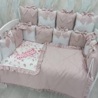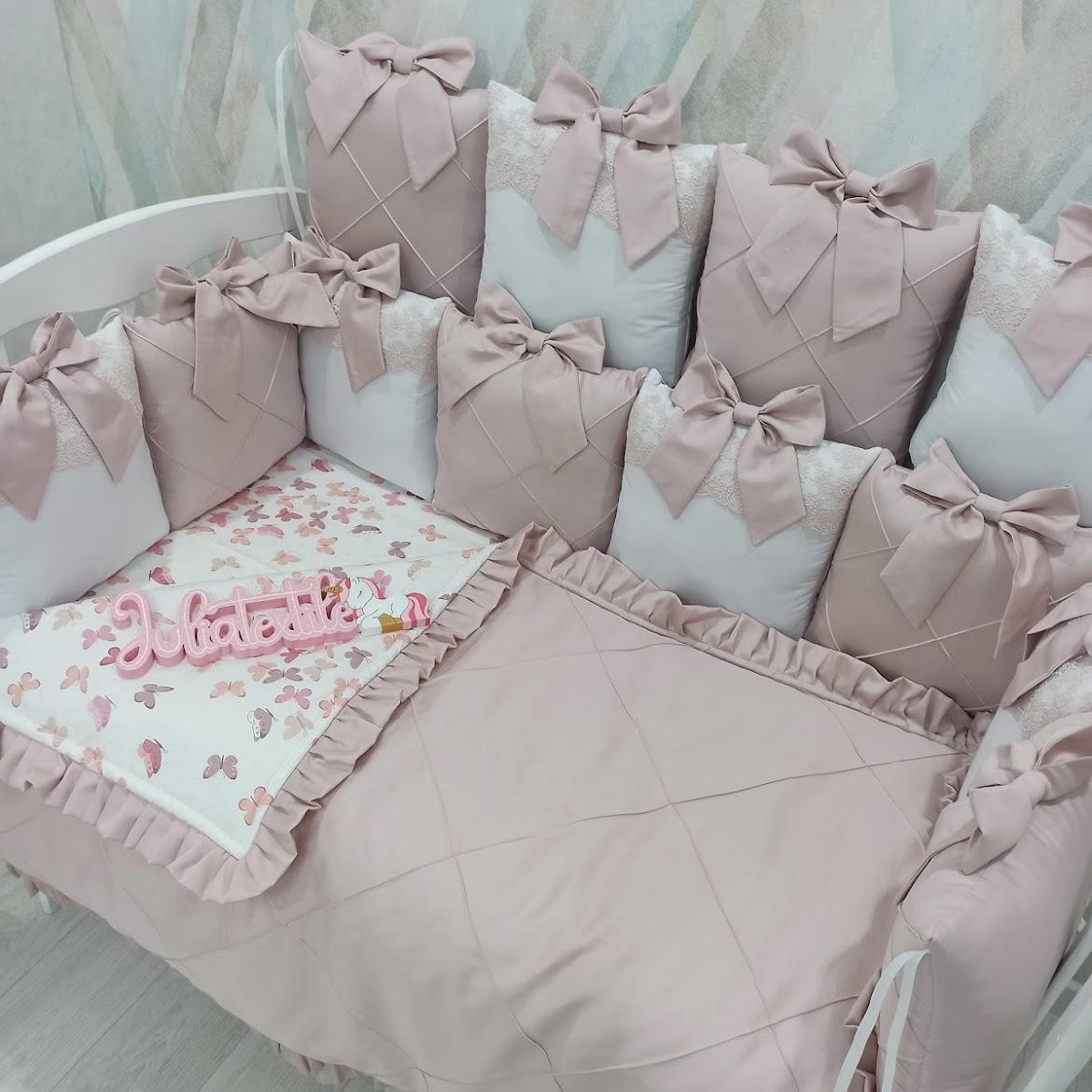 Il set include 12 cuscini paracolpi realizzati in morbido tessuto di cotone raso, perfetti per proteggere e arredare con stile. Puoi personalizzare il set aggiungendo dettagli in pizzo per un tocco ancora più elegante.